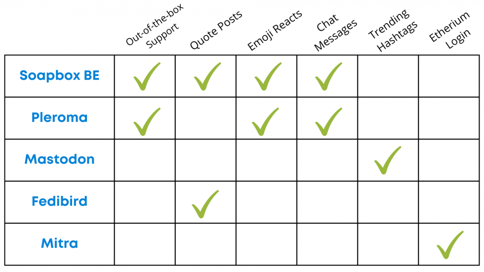The backend that you choose to use with Soapbox will determine the features that are available to your users. Soapbox prioritizes high-impact features that lead to increased discoverability and user retention — we believe this is the best focus for the overall growth of the Fediverse. Other software is more suited for niche communities with specific interests (like crypto). Overall, Soapbox BE includes the most features currently supported by Soapbox.