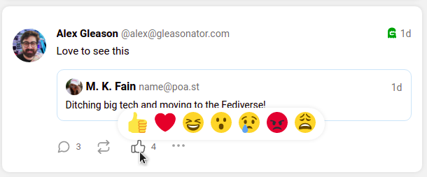 Emoji Reacts to posts were originally implemented in Pleroma, and are also available in Soapbox BE. Admins are able to customize which emojis are available in the reaction drawer. On Mastodon, only “likes” are supported.