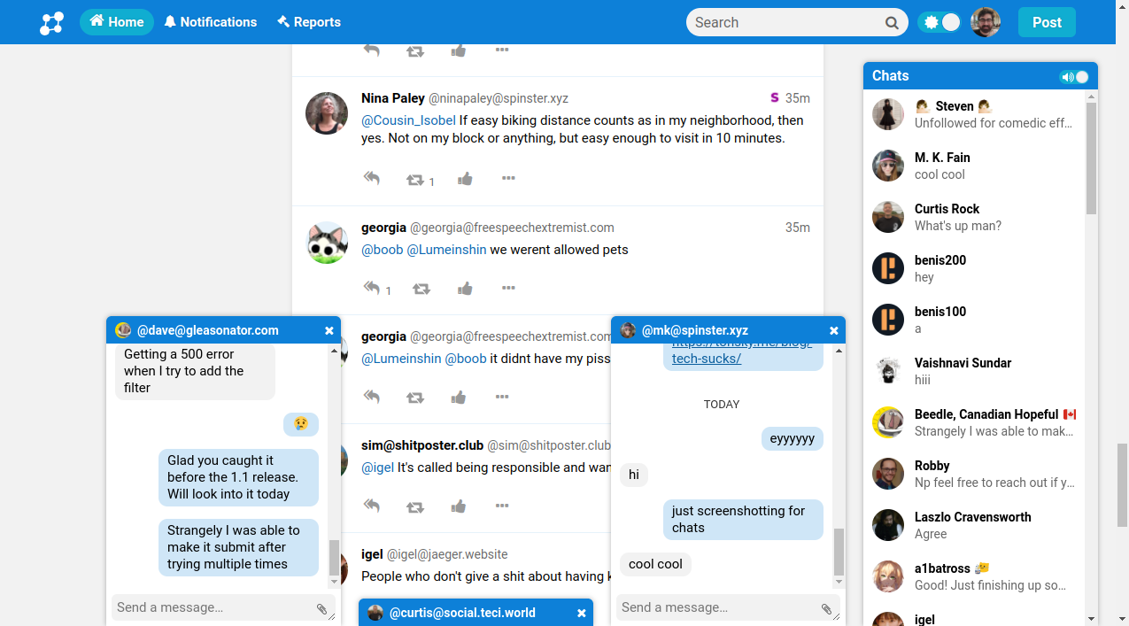Chat messaging is another feature originally implemented in Pleroma, and now also available in Soapbox BE. Mastodon allows users to send “private messages” as regular posts with a locked scope to only mentioned users.