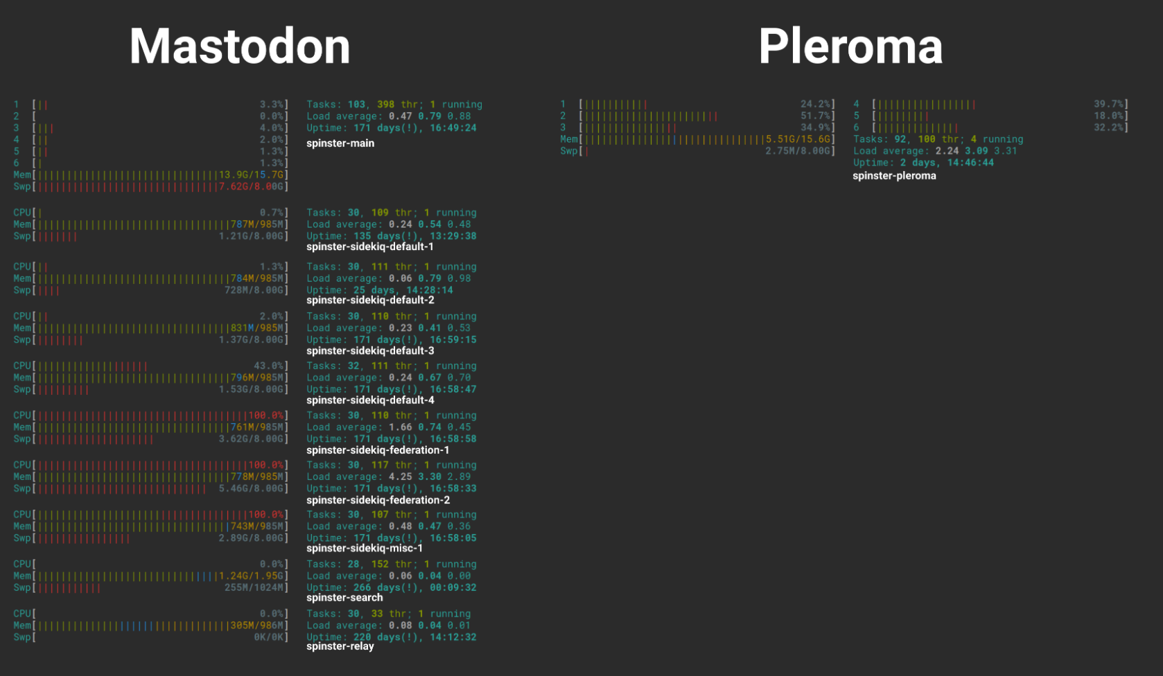 For most servers, Pleroma is by far the more efficient and afforable option, requiring far few resources. In August of 2020, Spinster.xyz, one of the largest Soapbox servers, made history when it migrated over 10,000 users from Mastodon to Pleroma. The above graphic demonstrates the server resources required to keep this userbase online in Mastodon vs Pleroma. Pleroma required significantly fewer resources, and Spinster was able to cut their server costs by over half by moving to Pleroma.