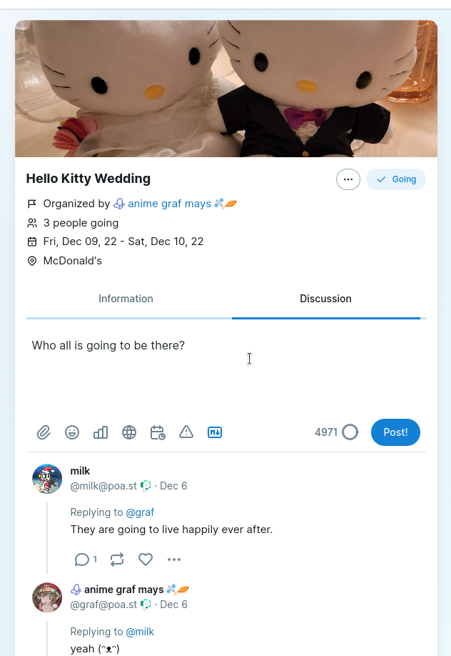 The biggest new feature available only in Rebased - federated events! Users can post conferences, meetups, online events, or just have some fun.