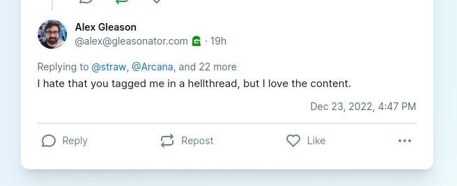- Posts: hover the "replying to" line to see a preview card of the parent post.