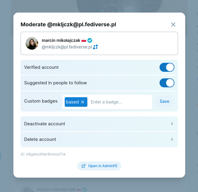It is also now possible for admins to add custom badges to accounts. These badges are local-only and do not federate, but admins can add badges to both local and remote users.