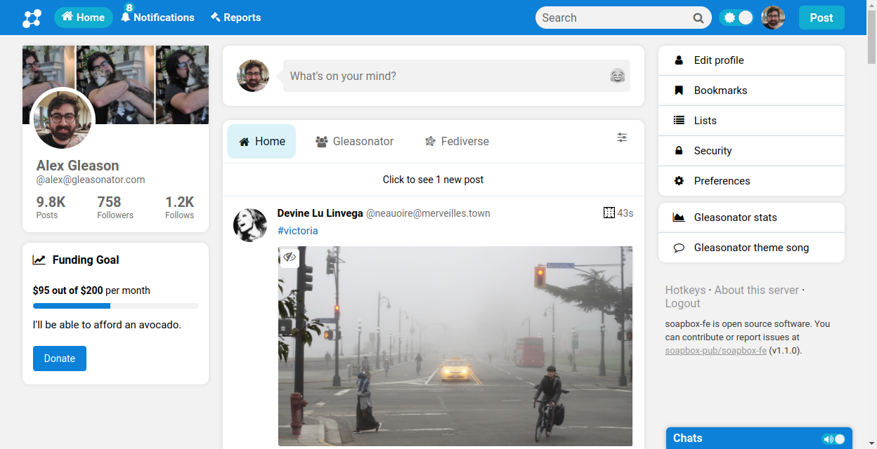Pleroma is a free and open source, federated, social media software allowing anyone to host their own online community. Servers can cross-communicate with other servers on the network thanks to federation. Soapbox FE is a sleek user interface that server admins can install on top of Pleroma.