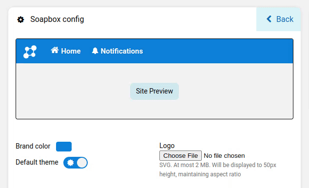 A big promise of Soapbox has always been server customization. As an admin, you're expected to bring your own brand. In older versions of Soapbox this required manually editing a file on the server, but now site settings such as logo and brand color can be customized right through the GUI.
