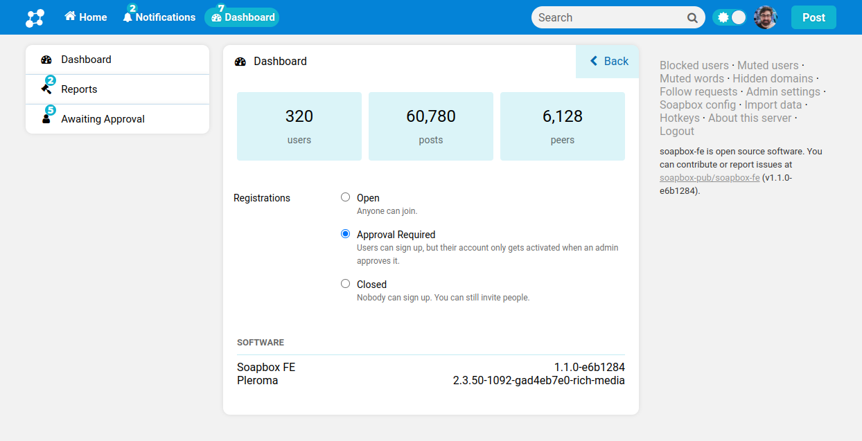 With a slew of administration new features, this release builds on the stability of the v1.1 release. It brings us up to speed with Pleroma 2.3, released last month. Managing a Fediverse server can be challenging. That's why we brought the most important admin features into a convenient dashboard.