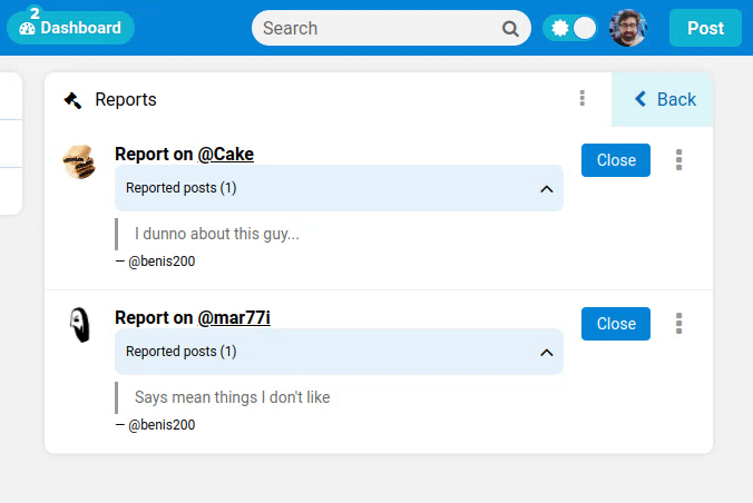 Reports can now be handled directly within Soapbox! Admins will get notified of reports. Take actions on reports, or close many reports quickly.