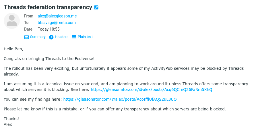 In our tests, we are consistently unable to fetch from Threads using the above domains. But without transparency from Meta, it's impossible to know whether the blocks are intentional.