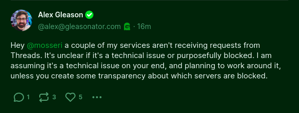 People have been wondering what Threads is going to do. Are they going to import a blocklist? Are they going to block individual servers at all?